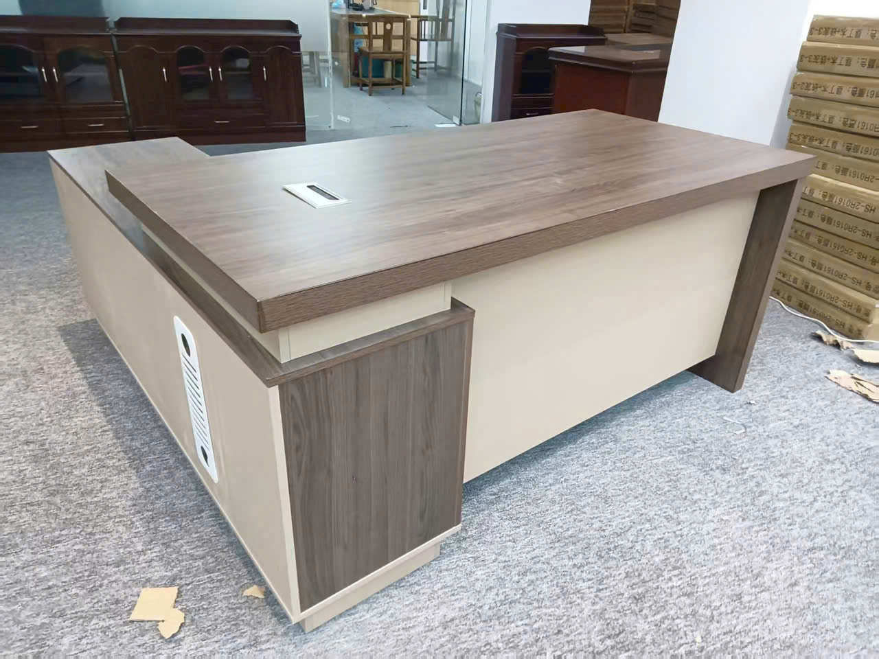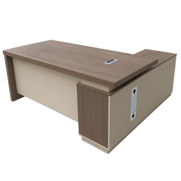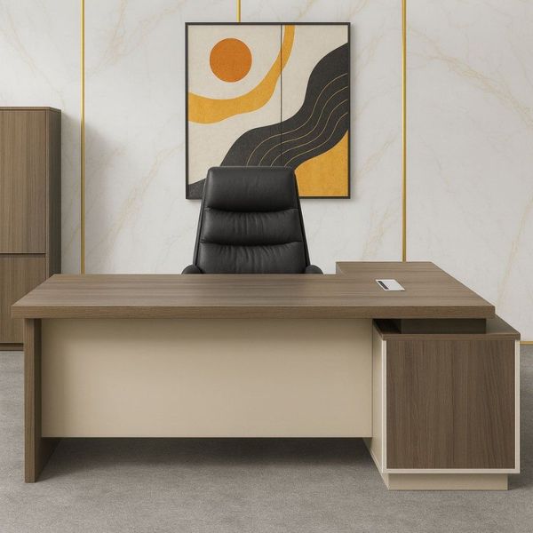 - Thiết Kế Hiện Đại, Tinh Tế: Bàn được thiết kế theo phong cách tối giản nhưng vô cùng hiện đại, với các đường nét dứt khoát, mạnh mẽ, phản ánh uy quyền của người lãnh đạo. Mặt bàn rộng rãi, hình chữ L có mặt phụ đi kèm tối ưu hóa không gian làm việc.