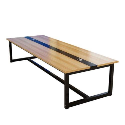 - Điểm nhấn trung tâm: Dải vân màu hoặc dải kính/mica đen chạy dọc chính giữa bàn, không chỉ tăng tính thẩm mỹ mà còn là vị trí bố trí các ổ cắm điện, sạc âm, góp phần giấu dây một cách gọn gàng. (Như hình ảnh mô tả).