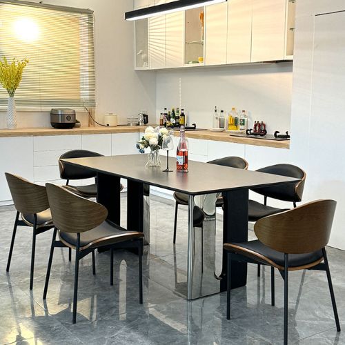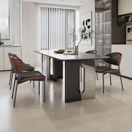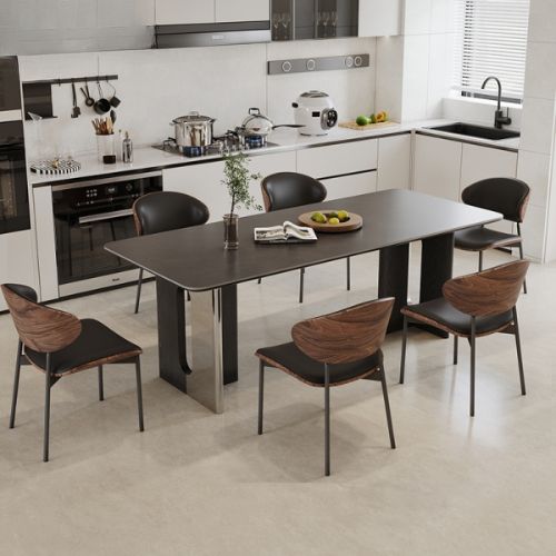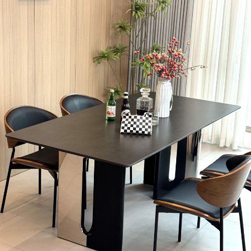 • Ghế ăn: Form ghế rộng rãi, nệm mút chống xẹp lún, da PU cao cấp thoáng khí, lưng ốp gỗ sồi uốn cong tinh xảo.