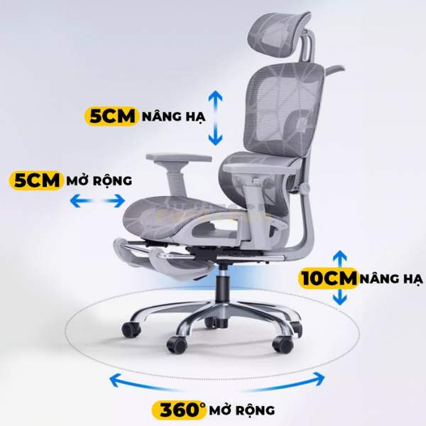 Tựa đầu có thể điều chỉnh độ cao và góc nghiêng, hỗ trợ tối ưu cho vùng cổ và vai gáy, đặc biệt khi bạn ngả lưng thư giãn hoặc cần một điểm tựa vững chắc trong quá trình làm việc.