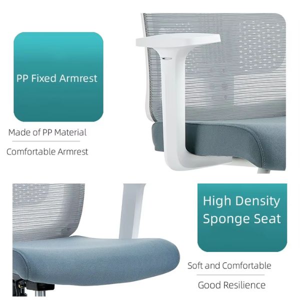 Đệm ngồi: Sử dụng mút xốp bọc vải nỉ thoáng khí, độ đàn hồi cao, chống xẹp lún, giúp người dùng thoải mái tuyệt đối khi ngồi làm việc suốt 8 tiếng.