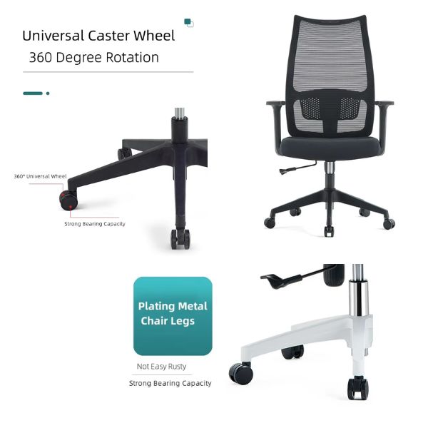 Chân xoay 360 độ: Chân ghế hình sao 5 cánh vững chãi kèm bánh xe nhựa PU di chuyển mượt mà, không gây trầy xước sàn nhà và không gây tiếng ồn.
